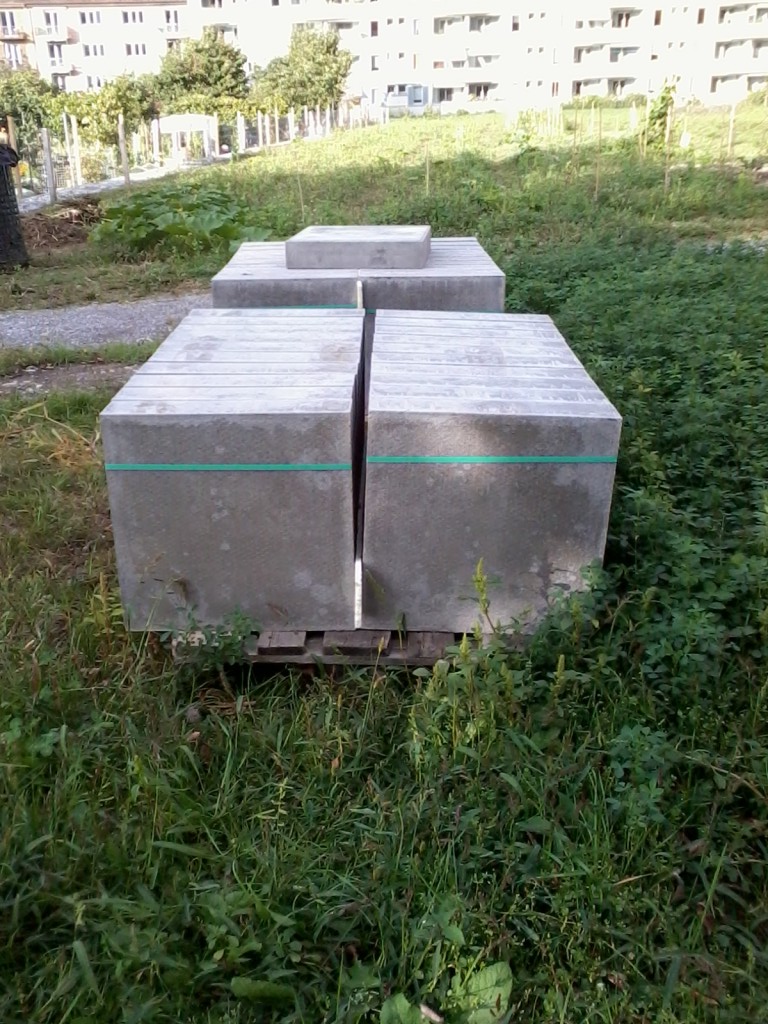Am Freitag zu unserem Entzücken vorgefunden: 2 Paletten massive Betonplatten, zukünftige Fundamente für Pergola und Werkzeugschuppen, die ab morgen aufgebaut werden!