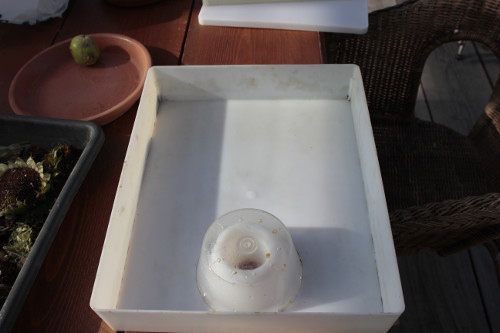 Ein Adamkasten: er wird gefüllt mit einer feinen Suppe aus Biozucker, Kamillentee und einer Prise (jodfreiem) Salz und dann wieder zugedeckelt. Das runde Ding ist eine Vorrichtung, durch die die Bienen an den süssen Saft kommen, ohne darin zu ertrinken.