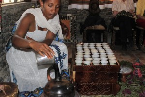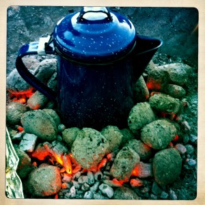 … oder Buna, so wie ich ihn in Äthiopien kennengelernt habe, denn zu einer meiner schönsten Ferienerinnerungen zählt der Kaffee, den uns Madame ‚Sonne des Lebens‘ in Lalibela zubereitet hatte, stilecht mit Popcorn und Weihrauch. Buna hat den Vorteil, dass sie mit einfachsten Mitteln zuzubereiten ist und damit das auch klappt, wenn ich mal nicht da bin, hier die Anleitung! Nach dem Grillen braucht man noch ordentlich Glut in der Feuerschale, in die man die Blechkanne voller Wasser stellt. Glut rundherum anhäufen, dann geht es schneller. Vorsicht, die Blechkanne wird sehr heiss! Deckel mit einem Werkzeug umlegen, Griff mit einem mehrfach gefalteten Tuch fassen! Derweil das Wasser heiss wird, mische man 3-4 Esslöffel Kaffee, etwas Zimt und Kardamom in einer grossen Kaffeetasse (ideal wäre natürlich ein Äthiopier, aber es geht natürlich mit jedem Kaffee, solange er nur sehr fein gemahlen ist). Original wäre es natürlich richtig, die grünen Bohnen auf der Glut zu rösten und dann im Mörser fein zu zerstampfen. Noch fehlt uns der Mörser… Wenn das Wasser kocht, etwas Wasser in die Tasse zum Kaffee giessen, Kanne wieder auf die Glut stellen (vorsicht, Griff!). Den Kaffeeschlamm umrühren und zurück ins kochende Wasser giessen. Kanne vom Feuer nehmen, kurz ziehen lassen, ein Paar Krümel Weihrauch (wenn vorhanden) auf die Glut geben, den Kaffee in kleinen Tässchen servieren, Zucker nach Belieben! Der Bodensatz erfreut Blumen und ärgert Schnecken!